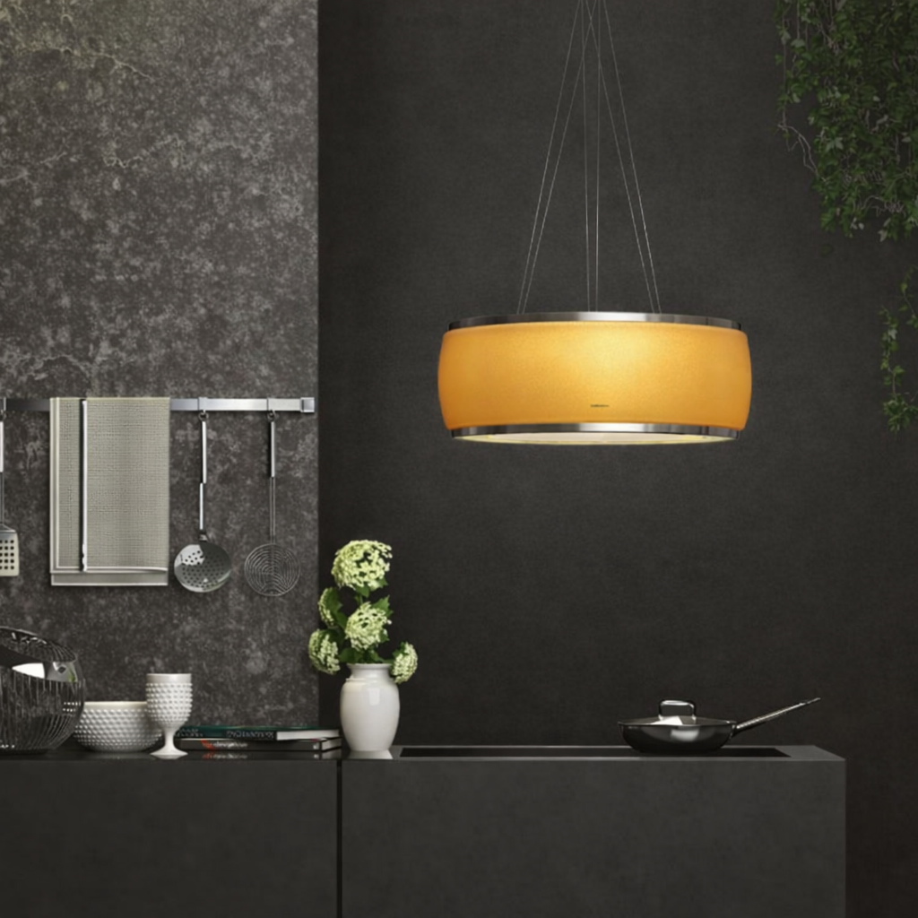 El yapımı amber satine cam gövdesi mutfak dekorunu tamamlar. Modern tasarımı ve LED aydınlatmasıyla hem fonksiyonel hem dekoratif bir odak noktası oluşturur.